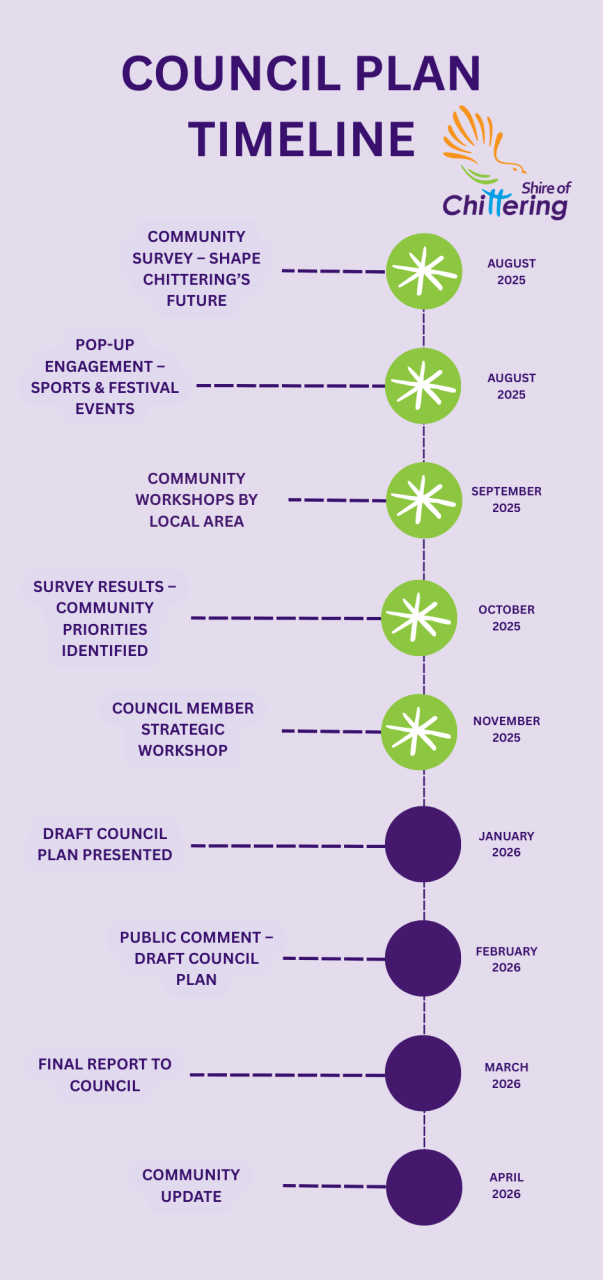 Community engagement starts at the beginning of August 2025 and concludes in mid-September 2025, prior to the local government elections. Internal planning will begin in November 2025 with the new Council. The draft Council Plan is expected to be completed by March 2026 and will go out for public comment before being finalised and adopted by Council in April/May 2026.