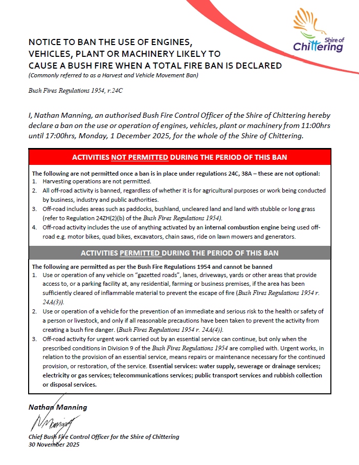 Harvest and Vehicle Movement Ban declared for Monday, 1 December 2025