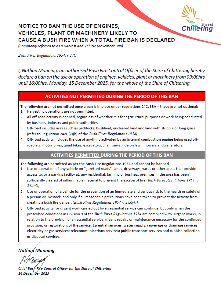 Harvest and Vehicle Movement Ban declared for Monday, 15 December 2025