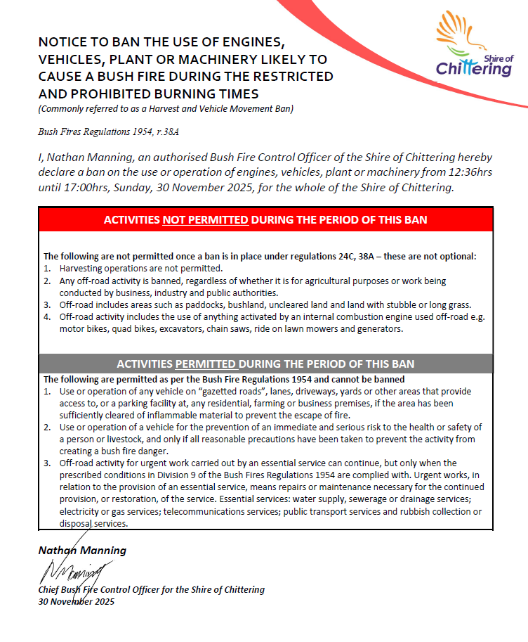 Harvest and Vehicle Movement Ban declared for Sunday, 30 November 2025