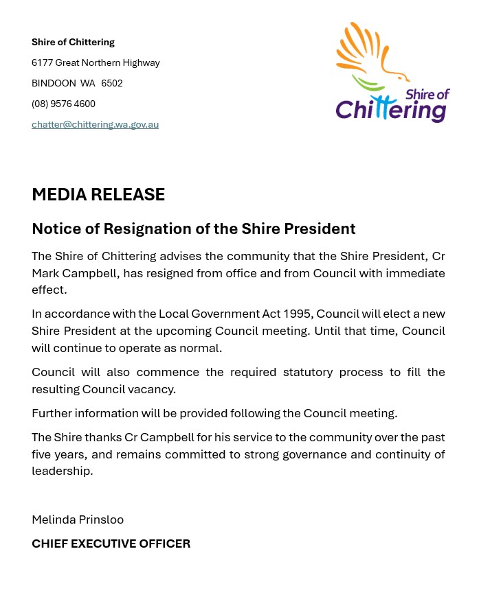 MEDIA RELEASE - Notice of Resignation of Shire President