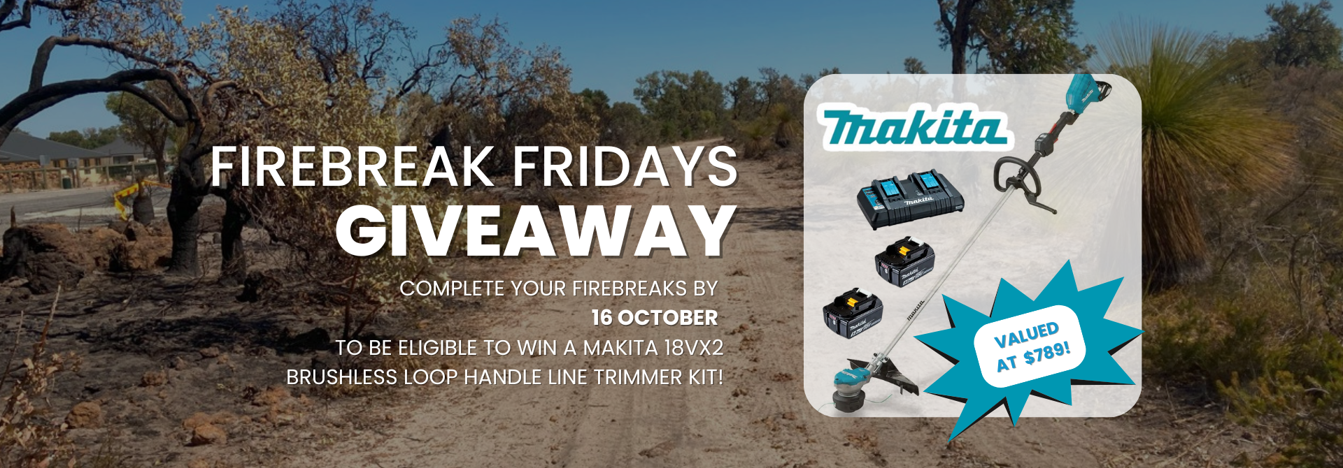 Starting Thursday, 16 October 2025, Fire Control Officers will be conducting inspections and nominating one standout property each week. All weekly winners will go into the draw for a chance to win a Makita 18Vx2 Brushless Loop Handle Line Trimmer Kit, valued at $789.